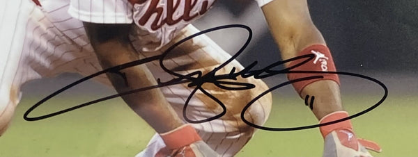 Featured is a Jimmy Rollins signed framed 11x14 Philadelphia Phillies baseball photo. This photo was hand signed by Jimmy Rollins and authenticated by Beckett authentication services. Included with the photo is a Beckett hologram and certificate of authentication. The frame measures 16x20 in total size and is ready is for display. SPECIFICATIONS Autographed By: Jimmy Rollins Team: Philadelphia Phillies Sport: Baseball-MLB Authentication: Beckett Grading Services