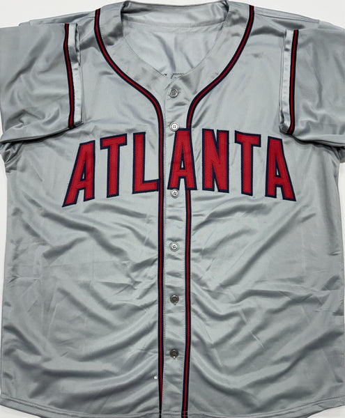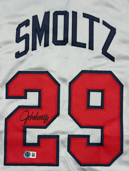 Custom Replica Grey Jersey of Atlanta Braves Hall of Famer JOHN SMOLTZ. This jersey is signed with Black Sharpie. This jersey is size XL with all letters and numbers sewn in. This item was signed at a private signing with us and would make a great addition to any Braves collection. This autograph is guaranteed to be 100% authentic and will include a COA from Beckett Authentication.