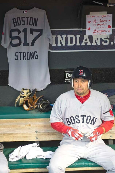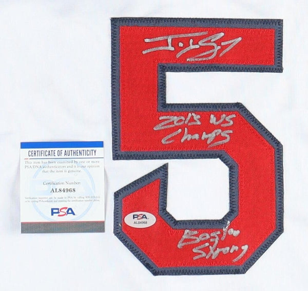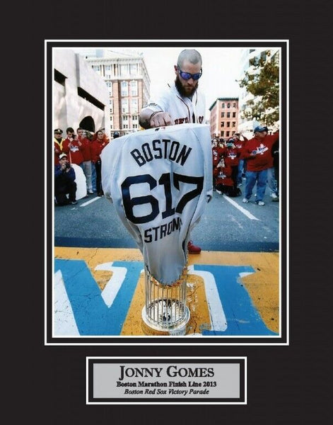 Custom jersey is size XL. Everything sewn on. Hand-signed and inscribed by Jonny Gomes.Throughout the 2013 World Championship season, the Red Sox players and organization formed a close association with the city of Boston and its people in relation to the Boston Marathon Bombing that occurred on April 15, 2013. On April 20, the day after the alleged bombers were captured, David Ortiz gave a pre-game speech following a ceremony honoring the victims and the local law enforcement, in which he stated, "This is our f**king city! And nobody is going to dictate our freedom! Stay strong!" For the entirety of the season, the team wore an additional arm patch that exhibited the Red Sox "B" logo and the word "Strong" within a blue circle. The team also hung up in the dugout a custom jersey that read "Boston Strong" with the number 617, representing the city of Boston's area code. On many occasions during the season, victims of the attack and law enforcement involved were given the honor of throwing the ceremonial 1st pitch. Following their victory in the 2013 World Series, the first one clinched at home in Fenway Park since 1918, Red Sox players Jonny Gomes and Jarrod Saltalamacchia performed a ceremony during the team's traditional duck boat victory parade, in which they placed the World Series trophy and the custom 617 jersey on the Boston Marathon finish line on Boylston Street, followed by a moment of silence and the singing of "God Bless America". This ceremony helped the city "reclaim" its spirit that was lost after the bombing. Overall, the Red Sox team and organization played a role in the healing process after the tragedy, owing to the team's unifying effect on the city.The autograph includes an official PSA/DNA hologram and matching COA for authenticity purposes. The signing of this item was witnessed by PSA.Authentication: PSA COA