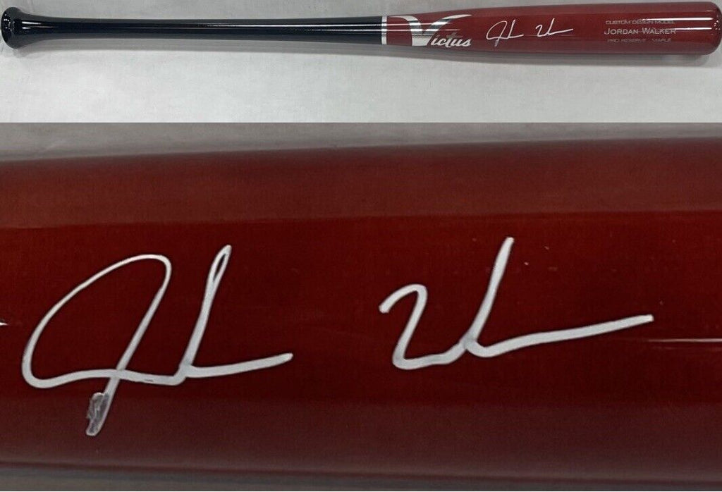 Jordan Walker hand signed Victus Red and Black Game Model Baseball Bat autograph with Fanatics and MLB certification. Hot young rookie and top prospect in the MLB. Started his career with a 12 game hit streak. Game model bat!
