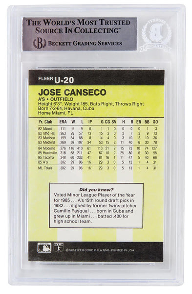 Jose Canseco signed Oakland A's 1986 Fleer baseball rookie card #U-20. The card has been authenticated and encapsulated by Beckett Authentic and the authentication number can be verified online. The image of the item is a stock photo, as we may have multiples of the item in stock. The Slabbed Card you will receive will be of the card described. (Same grade, Same authentication) You may or may not receive the exact Beckett serial number on the slab label shown in image.