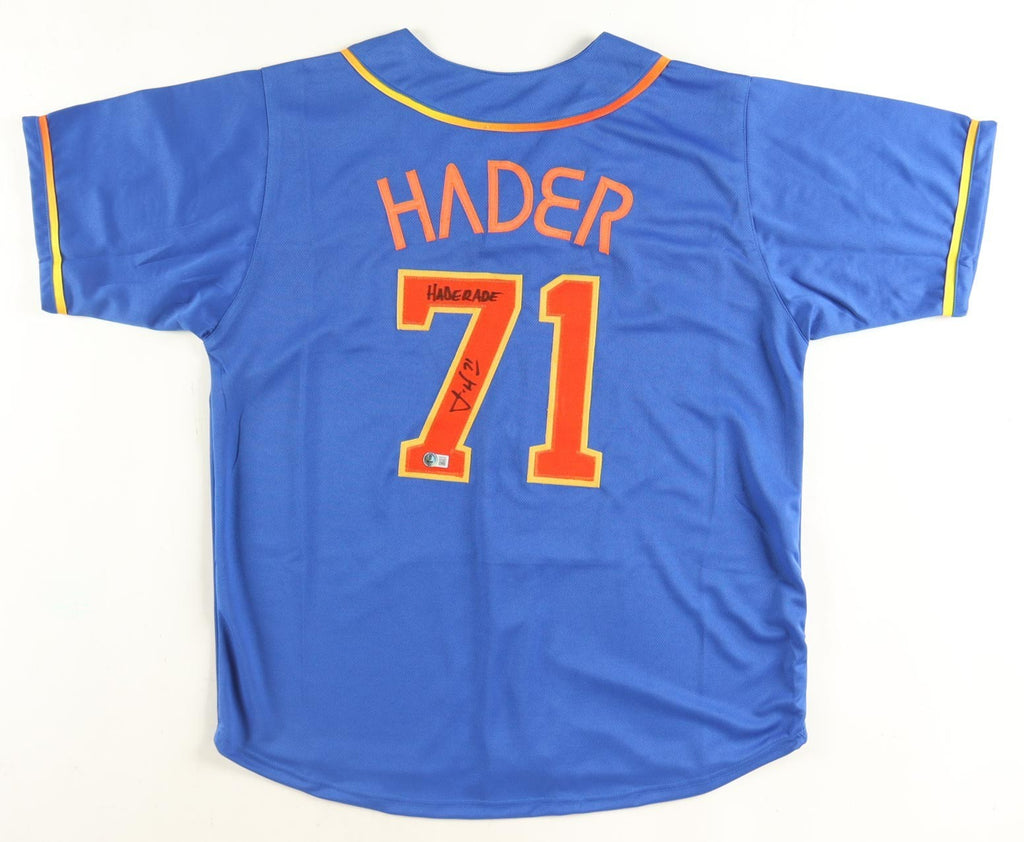 Custom on-field style City Connect; Space City jersey with everything sewn on, size XL. Hand-signed and inscribed "Haderade" by Josh Hader.The autograph includes an official Beckett Authentication Services serially numbered hologram and QR Code card for authenticity purposes. The signing of this item was witnessed by Beckett.Authentication: Beckett Hologram with Scannable QR Code cardOn all signed jerseys up for auction stock images are used in these listings. ALMOST ALL OUR SIGNED JERSEYS ARE ADULT XL unless otherwise noted (It's the preferred size for autograph collectors for display purposes) The exact item you will receive will be the Same player as the one pictured, but may have the signature in different spots, be signed in a different color paint pen, and have different inscriptions than the photo shown. WE ARE NOT A WHOLESALER; WE TRY TO OFFER LOW PRICED SIGNED JERSEYS TO OUR CUSTOMERS SO EVERYONE GETS A FAIR CHANCE AT LOW PRICES ON QUALITY ITEMS. If you're buying multiple items, please don't pay until you purchase all your auction items for that week (Thursday thru Sunday) We'll send you an invoice when all our weekly auctions are over on either Saturday or Sunday evening at 10:30 pm depending on how many items we have listed that week. We will adjust your shipping at this point. On some items that we have 2 dozen or more of in stock we may offer a 2nd chance after the auction ends. If you purchase via 2nd chance offers, please click on the items you wish to buy & then message us to adjust the shipping before you make any payments to us. Thank you & Happy BiddingALL INTERNATIONAL SHIPPING ON THESE ITEMS IS DONE THROUGH THE eBAY GLOBAL SHIPPING PROGRAM. PLEASE BE AWARE OF THESE COSTS BEFORE BIDDING.