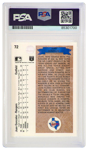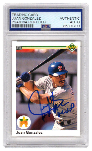 Juan Gonzalez signed Texas Rangers 1990 Upper Deck rookie baseball card #72 with '2x AL MVP' inscription. The card has been authenticated and encapsulated by PSA and the authentication number can be verified online.