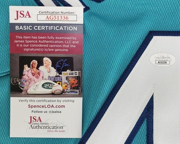 This autographed jersey has been personally hand-signed by Julio Rodriguez of the Seattle Mariners. This autograph is certified by James Spence Authentication (JSA). It comes with the numbered hologram and matching Certificate of Authenticity.Custom on-field style jerseys are a more affordable option for autograph seekers. These jerseys do not have any brand name or tags and are made in the Philippines. They feature stitched on names and numbers and are made to look very similar to the on-field jerseys that the players wear. These custom jerseys are very commonly used in the memorabilia industry.**Please note, the signature shows minor imperfections. See photos.