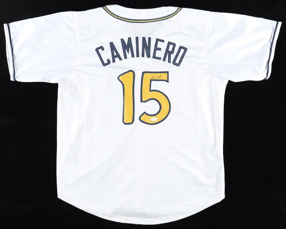 Custom on-field style jersey. Everything sewn on, size XL. Hand-signed by Junior Caminero.The autograph(s) includes an official James Spence Authentication (JSA) hologram and QR Code Card for authenticity purposes.Authentication: JSA Hologram with QR Code Card