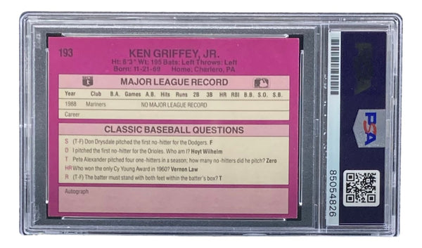 Featured is a Ken Griffey Jr Seattle Mariners signed 1989 Classic Baseball #193 rookie card. This card has been hand signed by Griffey and has been authenticated and encapsulated by PSA. This card would make a great addition to any sports memorabilia collection!. SPECIFICATIONS Autographed By: Ken Griffey Jr Team: Seattle Mariners Sport: Baseball Authentication: Professional Sports Authenticator (PSA)