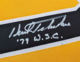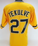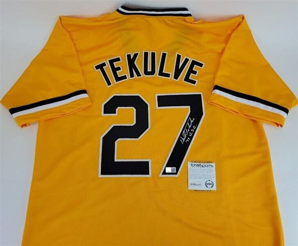 This autographed custom on-field adult XL jersey has been personally hand-signed by Kent Tekulve of the Pittsburgh Pirates. When signing, Tekulve inscribed "79 W.S.C" along with his signature.This autograph is certified by Total Sports Enterprises (TSE). It comes with the Total Sports Enterprises authentication hologram and Certificate of Authenticity.Custom on-field style jerseys are a more affordable option for autograph seekers. These jerseys do not have any brand name or tags and are made in the Philippines. They feature stitched on names and numbers and are made to look very similar to the on-field jerseys that the players wear. These custom jerseys are very commonly used in the memorabilia industry.