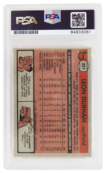 Leon Durham signed St Louis Cardinals 1981 Topps rookie baseball trading card #321. The card has been authenticated and encapsulated by PSA/DNA and the number can be verified online. The image of the item is a stock photo, as we may have multiples of the item in stock. The Slabbed Card you will receive will be of the card described. (Same grade, Same authentication) You may or may not receive the exact PSA serial number on the slab label shown in image.