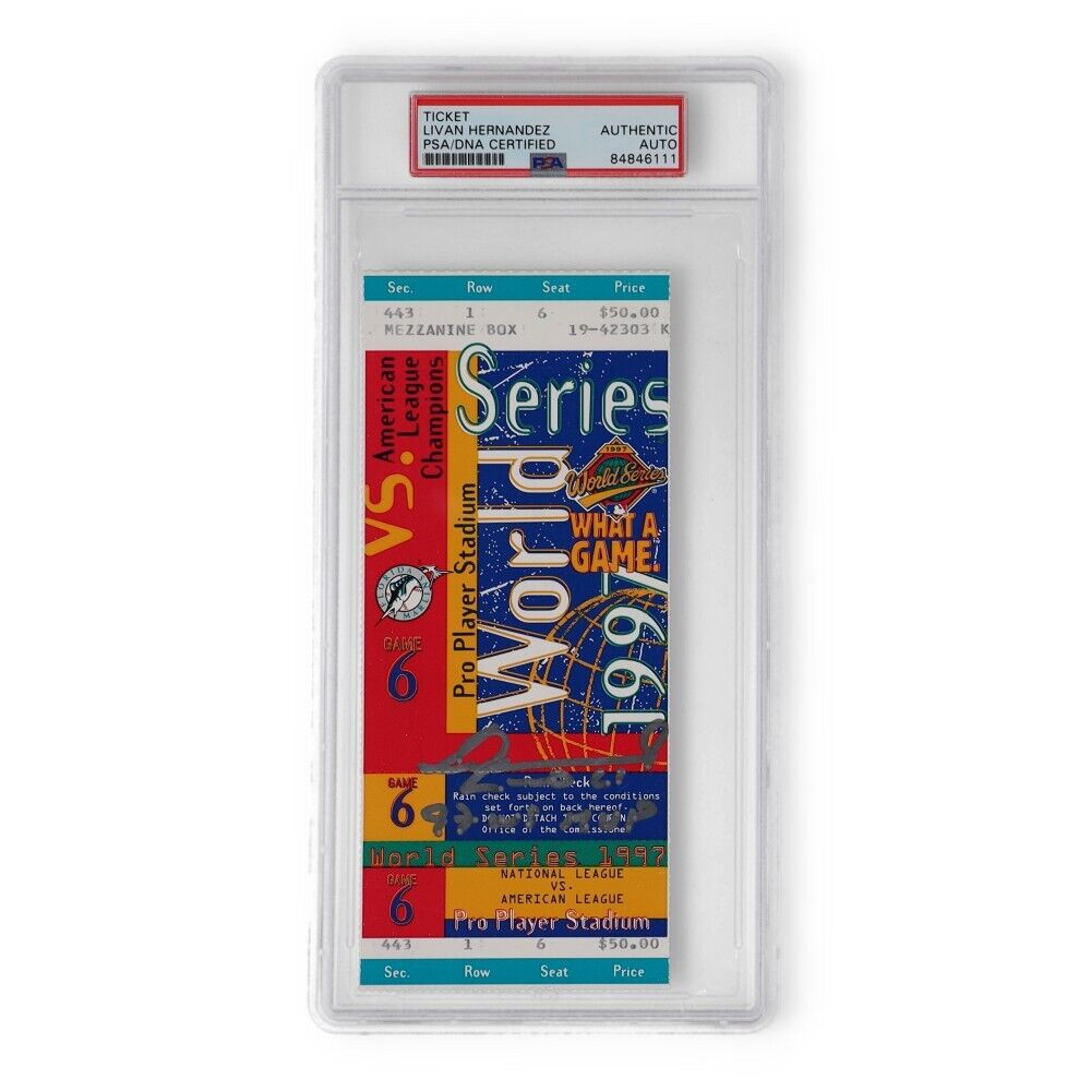 Ticket has been hand-signed and inscribed by Livan Hernandez (Florida Marlins).The autograph(s) has been authenticated and encapsulated by PSA/DNA for authenticity purposes.Authentication: PSA Encapsulated