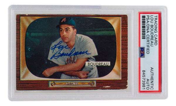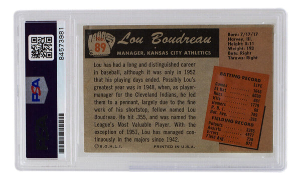 Featured is a Lou Boudreau signed 1955 Kansas City Athletics baseball card #89. This card has been signed by Lou Boudreau and has been slabbed and authenticated by PSA authentication services. This item would make a great addition to any sports memorabilia collection. SPECIFICATIONS Autographed By: Lou Boudreau Team: Kansas City Athletics Sport: Baseball Authentication: Professional Sports Authenticator (PSA)
