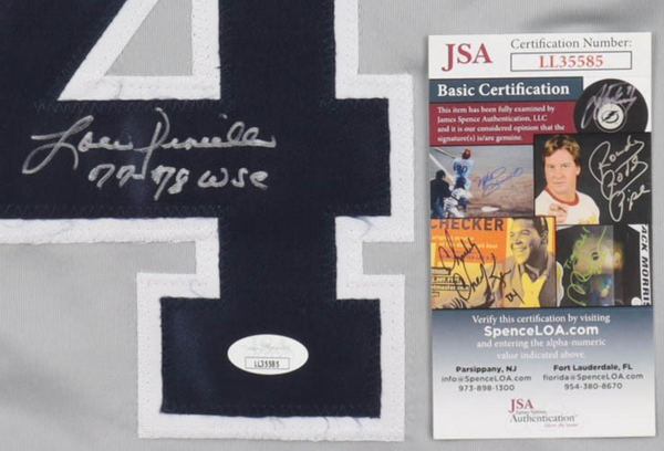 Custom on-field style jersey. Everything sewn on, size XL. Hand-signed and inscribed by Lou Piniella.The autograph(s) includes an official James Spence Authentication (JSA) hologram and matching COA for authenticity purposes.Authentication: JSA COA