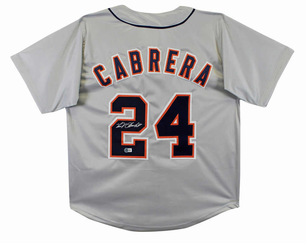 This Autographed Grey Pro Style Jersey has been Personally Signed by Miguel Cabrera of the Detroit Tigers. This item is 100% Authentic to include a hologram by Beckett Authentication Services. This item will come with an affixed Beckett Authentication Services (BAS) authentication sticker, which includes a scannable QR code to verify authenticity. Please note that Beckett no longer provides serial-numbered COA cards, and the attached BAS sticker will serve as the complete authentication for this item. We have multiples of this same item. While the photographs are representative of this item, the size, placement and strength of the signature may vary. Each item is hand signed, therefore, each autograph is unique. This is a X-Large sized, non-branded, custom-stitched Jersey.