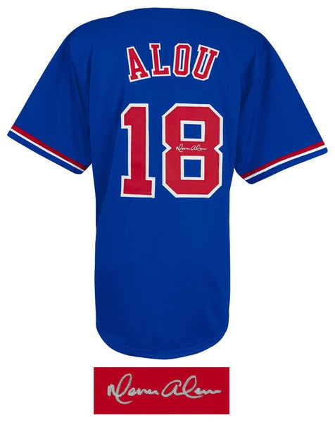 Moises Alou signed blue throwback custom baseball jersey. Item comes with a Schwartz Sports Memorabilia tamper-proof numbered hologram and Certificate of Authenticity which can be verified online. Jersey is size XL.