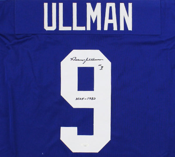A Toronto Custom Blue Jersey hand signed by Norm Ullman. The item and signature are in excellent condition. In addition to signing his name, Norm inscribed "HOF 1982" on the item. Dave was a dynamic center for the Toronto Maple Leafs, winning the Calder Trophy as a rookie of the year, capturing four Stanley Cups (1962-1964, 1967), earning the conn Smythe Trophy in 1967, two Lady Byng Trophies, and a rightful place in the Hockey Hall of Fame in 1986. AUTHENTICATION: The item is accompanied by a JSA Certificate of Authenticity - JSA Serial Numbered Hologram -