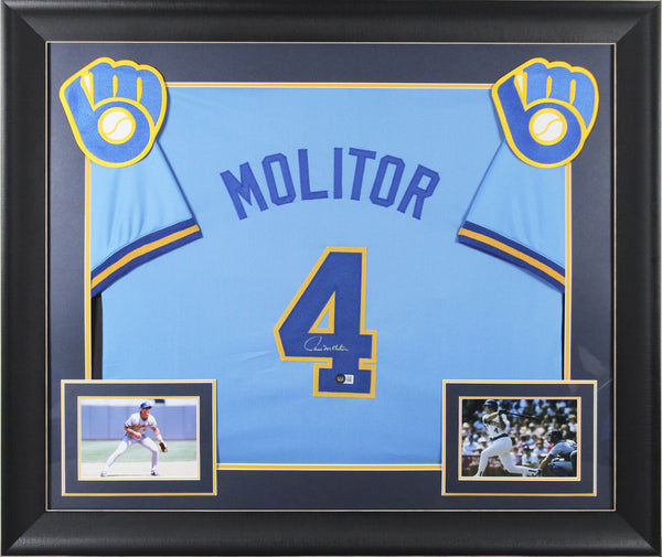 This Autographed Light Blue Pro Style Framed Jersey has been Personally Signed by Paul Molitor of the Milwaukee Brewers. This item is 100% Authentic to include a hologram by Beckett Authentication Services. This item will come with an affixed Beckett Authentication Services (BAS) authentication sticker, which includes a scannable QR code to verify authenticity. Please note that Beckett no longer provides serial-numbered COA cards, and the attached BAS sticker will serve as the complete authentication for this item. We conducted an autograph signing with Paul Molitor where multiples of the same item were signed. While the photographs are representative of this item, the size, placement and strength of the signature may vary. Each item is hand signed, therefore, each autograph is unique. This item can be verified through BAS. This item has been professionally framed to overall dimensions of approximately 32 x 37 inches. This is a X-Large sized, non-branded, custom-stitched Framed Jersey. This jersey will be framed to order, it will take 3-4 days from purchase date for it to ship.