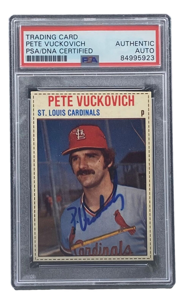 Featured is a Pete Vuckovich St. Louis Cardinals signed 1979 Hostess #87 trading card. This card has been hand signed by Vuckovich and has been authenticated and encapsulated by PSA. This card would make a great addition to any sports memorabilia collection!. SPECIFICATIONS Autographed By: Pete Vuckovich Team: Sport: Baseball Authentication: Professional Sports Authenticator (PSA)