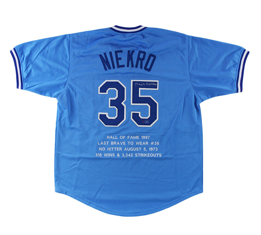 An Atlanta Custom Stat Powder Blue Jersey hand signed by Phil Niekro. The item and signature are in excellent condition. Phil is a former MLB Pitcher, He played 20 seasons for the Atlanta Braves. He is a 5x All-Star, 5x Gold Glover Award winner & 2x NL Wins leader. AUTHENTICATION: The item is accompanied by a Certificate of Authenticity - Serial Numbered and Databased Hologram