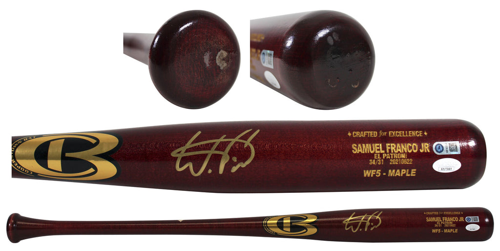 This Autographed Cooperstown Bat Player Model El Patron! WF5 Baseball Bat has been Personally Signed by Wonder Franco of the Tampa Bay Rays. This item is 100% Authentic to include a Certificate of Authenticity (COA) / hologram by JSA. This is a Signature Debut item, meaning this item was signed prior to the last game of the signers official rookie season. The authenticity can be verified on JSA Signature Debut website.