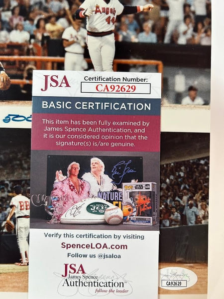 This product is an autographed 8x10 photo of baseball legend Reggie Jackson, commemorating his career home run number 500, which was hit while playing for the California Angels. The autograph has been authenticated by James Spence Authentication (JSA), ensuring its authenticity. This collectible item is a must-have for fans of baseball and the Angels franchise, showcasing a piece of sports history with a personal touch from one of the greatest players to ever grace the field.