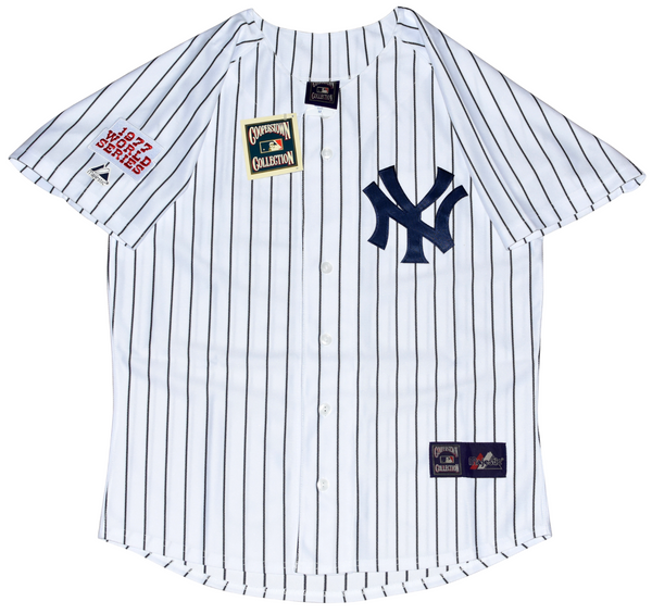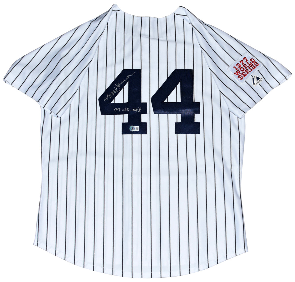 Reggie Jackson, former Hall of Fame outfielder for the New York Yankees, has hand signed this Yankees Majestic jersey with the 1977 World Series patch. He included the inscription "77 WS MVP" with his signature. Jersey is new with tags attached and everything is sewn-on. This item is authenticated by Beckett Authentication Services and was signed in the presence of one of their representatives. Their tamper-evident hologram featuring a QR code and serial number is on the item. The authenticity can be verified online by entering the serial number or scanning the QR code.Item pictured may not be the exact item you will receive. It will be similar quality, and we guarantee your satisfaction.
