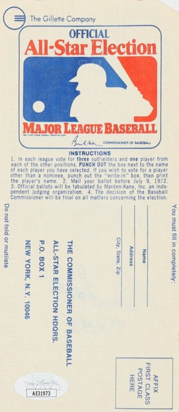 Original 1972 All-Star Game ballot has been hand-signed and inscribed by Ron Santo (D. 2010, Chicago Cubs, HOF).Santo died on December 3, 2010 in a hospital in Arizona, due to complications from bladder cancer and diabetes. Santo had lapsed into a coma on December 1st. A funeral mass was celebrated at Holy Name Cathedral on December 10, where Santo's casket was carried in by former teammates Ernie Banks, Fergie Jenkins, Randy Hundley, Glenn Beckert, & Billy Williams draped with the No. 10 flag that flew over Wrigley the day his number was retired. He was eulogized by his longtime broadcast partner Pat Hughes, along with Cubs owner Tom Ricketts and MLB Commissioner Bud Selig. Following the service, the procession paused outside Tribune Tower, home of WGN Radio, before heading north to circle Wrigley Field, starting at third base. Santo was later cremated, and his ashes scattered on the field at the Friendly Confines. On August 10, 2011, Santo was memorialized and "immortalized" at Wrigley Field with the presentation of a statue in his likeness. The statue is a portrayal of a young Santo playing defense at third base, leaning to his right while throwing a ball. The lot / autograph(s) includes an official James Spence Authentication (JSA) hologram and matching COA for authenticity purposes.Authentication: JSA COA
