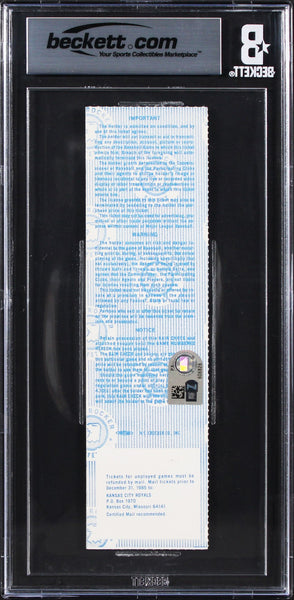 This Autographed October 27, 1985 World Series Game 7 Full Ticket Graded NM-MT 8 with an Auto Graded Gem Mint 10! has been personally signed by George Brett of the Kansas City Royals. This item is 100% authentic, it comes slabbed and authenticated by Beckett Authentication Services. The authenticity can be verified on Beckett Authentication Services website.