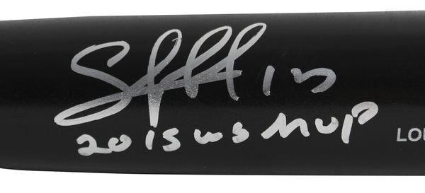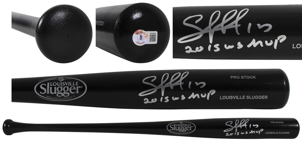 This Autographed Black Louisville Slugger Baseball Bat with the inscription of "2015 WS MVP" has been Personally Signed by Salvador Perez of the Kansas City Royals. This item is 100% Authentic to include a hologram by Beckett Authentication Services. This item will come with an affixed Beckett Authentication Services (BAS) authentication sticker, which includes a scannable QR code to verify authenticity. Please note that Beckett no longer provides serial-numbered COA cards, and the attached BAS sticker will serve as the complete authentication for this item. This is a BAS Witnessed Protection Program item which means a Beckett Authentication Service representative was present when this item was being signed. We conducted an autograph signing with Salvador Perez where multiples of the same item were signed. While the photographs are representative of this item, the size, placement and strength of the signature may vary. Each item is hand signed, therefore, each autograph is unique. This item can be verified through BAS Witnessed.