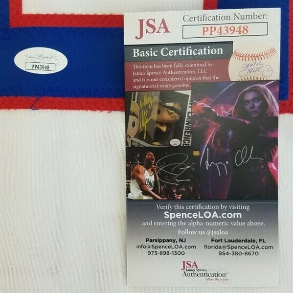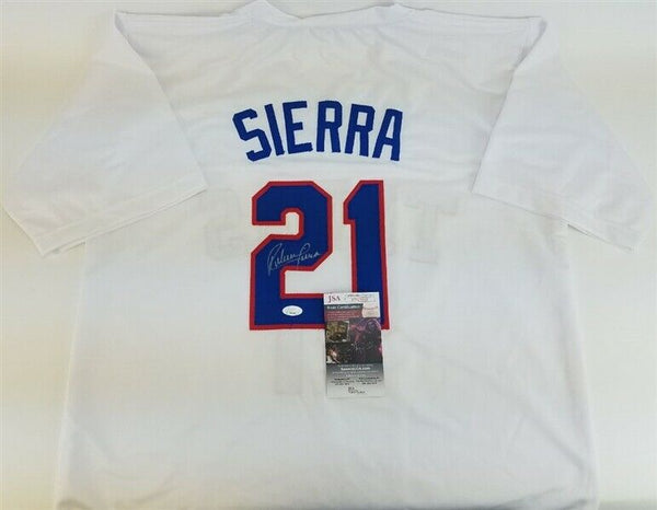 Custom on-field style jersey. Everything is sewn on, size XL. Hand-signed in silver paint pen by Ruben Sierra. The lot / autograph(s) includes an official James Spence Authentication (JSA) hologram and matching COA for authenticity purposes. The signing of this item was witnessed by JSA.Authentication: JSA COA