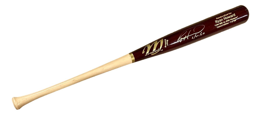 Featured is a Ryan Howard signed Marucci Game Model baseball bat, inscribed "6/27/07" (the date he hit his 100th Home Run). This bat has been hand signed by Howard and comes with the Howard exclusive hologram and certificate of authenticity. This is a limited edition bat is and is number 7 of 100. This bat would make a great addition to any sports memorabilia collection!. SPECIFICATIONS Autographed By: Ryan Howard Team: Philadelphia Phillies Sport: Baseball Authentication: Professional Sports Authenticator (PSA)