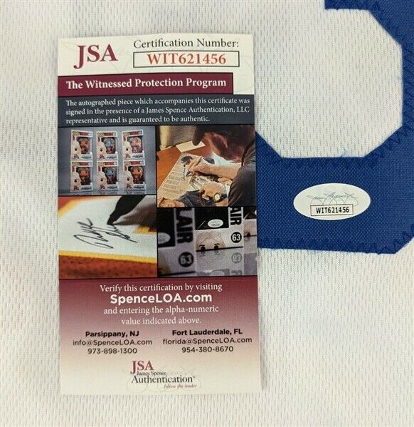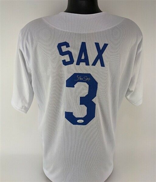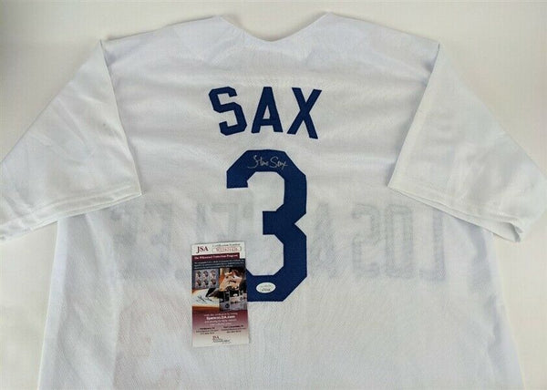 This autographed jersey has been personally hand-signed by Steve Sax of the Los Angeles Dodgers. This autograph is certified by James Spence Authentication's (JSA) Witnessed Protection Program. That means that a JSA representative was present when this item was signed. It comes with the numbered hologram and matching Certificate of Authenticity.Custom on-field style jerseys are a more affordable option for autograph seekers. These jerseys do not have any brand name or tags and are made in the Philippines. They feature stitched on names and numbers and are made to look very similar to the on-field jerseys that the players wear. These custom jerseys are very commonly used in the memorabilia industry.