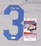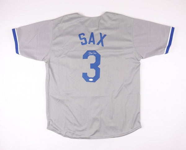 This autographed jersey has been personally hand-signed by Steve Sax of the Los Angeles Dodgers. This autograph is certified by James Spence Authentication's (JSA) Witnessed Protection Program. That means that a JSA representative was present when this item was signed. It comes with the numbered hologram and matching Certificate of Authenticity.Custom on-field style jerseys are a more affordable option for autograph seekers. These jerseys do not have any brand name or tags and are made in the Philippines. They feature stitched on names and numbers and are made to look very similar to the on-field jerseys that the players wear. These custom jerseys are very commonly used in the memorabilia industry.