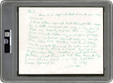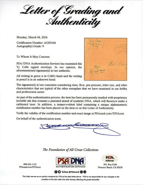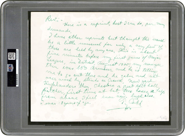 This Autographed Auto Graded Mint 9! 7.8x9.8 1905 MLB Debut Photo with the inscription of "4/18/60" has been Personally Signed by Ty Cobb of the Detroit Tigers. This item is 100% Authentic, it comes slabbed and authenticated by PSA/DNA. The authenticity can be verified on Professional Sports Authenticator website. Presented is a terrific opportunity to possess a Ty Cobb offering consisting of three unusual, and compelling, Cobb items: 1) A signed and inscribed photograph that shows "the Georgia Peach" on the Detroit Tigers bench just minutes before his Major League debut on August 30, 1905; 2) A detailed Cobb-signed note written on the back of the photograph to a Reverend Gerdau that is a great behind-the-scenes glimpse into the minutes just before Cobb's Major League debut; 3) A handwritten mailing envelope, addressed to the aforementioned Reverend Gerdau, containing Cobb's signature above the return address. Cobb is seated next to Bill Armour, in civilian clothes, the Detroit manager. On the photo back, Cobb, again using his "patented" green fountain ink, has inscribed and signed an incredible note, forthright and greatly revealing in its detailed candor: "Rev.: - Here is a reprint, best I can do, per many demands. I have other reprints but thought this would be a little unusual for only a very few of these are held by anyone. This is about five minutes before my first game of Major League [sic], in Detroit, August 1905. My manager then was Tom Armour. and he is telling me to go out there and be calm and not over awed [sic] by stands or crowd. New York Highlanders then. Chesbro, a great spitball pitcher, first time at bat, two bases, a help from above I feel even now. Luck also. I was 18 years of age. Ty Cobb." From Cobb's personal message, we can see that this offering came from Cobb and his personal collection. The offered image is very rare in itself, but then surpasses rarity and becomes UNIQUE, a treasure with the personal connections to Cobb.