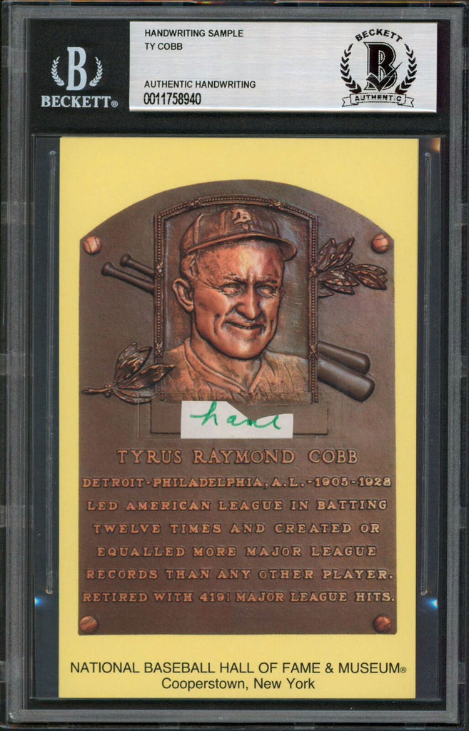 This 4 Word Hand Writing Sample 3.5x5.5 Hall Of Fame Plaque Postcard has been Ty Cobb of the Detroit Tigers. The authenticity can be verified on Beckett Authentication Services website. Please refer to photos for this item, you will receive a Beckett slabbed hand writing sample that has been cut an placed into this Hall Of Fame Plaque Postcard.