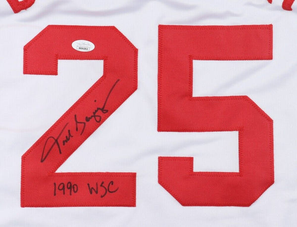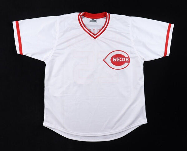 Custom on-field style jersey. Everything is sewn on, size adult XL. Hand-signed in black felt-tip pen by 1990 Cincinnati Reds World Champion 1st baseman Todd Benzinger. The autograph includes an official James Spence Authentication (JSA) hologram for authenticity purposes. Authentication: JSA Hologram