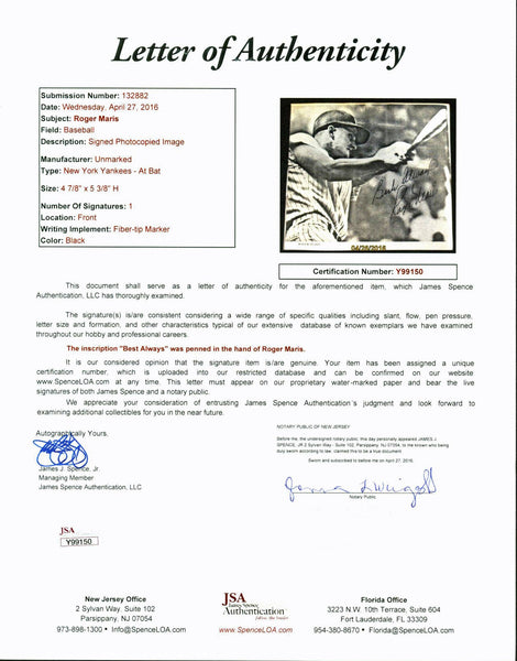 This is a 4.8x5.5 Cut Photo "Best Always" Authentic Signed that has been Personally Signed & Autographed by Roger Maris of the New York Yankees. Maris was known for his killer batting skills, being the first player to break Babe Ruth's single season home run record in 34 years. This photo features Maris doing what he did best - swinging the stick with all his might. It has been signed in black felt tip pen "Best Always, Roger Maris". This item is 100% Authentic to include a Certificate of Authenticity (COA) / hologram by JSA #Y99150.We offers a 100% Lifetime Guarantee on all Autographed & Signed New York Yankees Roger Maris memorabilia.