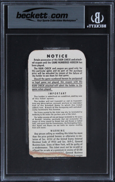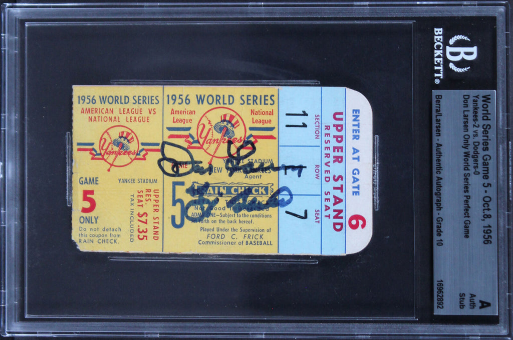 This Autographed Auto Graded Gem Mint 10! 1956 World Series Game 5 Perfect Game Ticket Stub has been Personally Signed by Yogi Berra & Don Larsen of the New York Yankees. This item is 100% Authentic, it comes slabbed and authenticated by Beckett Authentication Services. The authenticity can be verified on Beckett Authentication Services website.