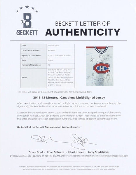 Official CCM jersey. Everything is sewn on, size adult Medium. Hand-signed by (16) members of the 2012 Montreal Canadiens team including Carey Price and Erik Cole, Peter Budaj (x2), Travis Moen, Hal Gill, Randy Ladouceur, Randy Cunneyworth, Mike Blunden, Raphael Diaz, Yannick Weber, Mathieu Darche and three others. Please note there are stains on the jersey (see photos).The autograph includes an official Beckett Authentication Services hologram and matching Letter Of Authenticity for authenticity purposes.Authentication: Beckett LOA