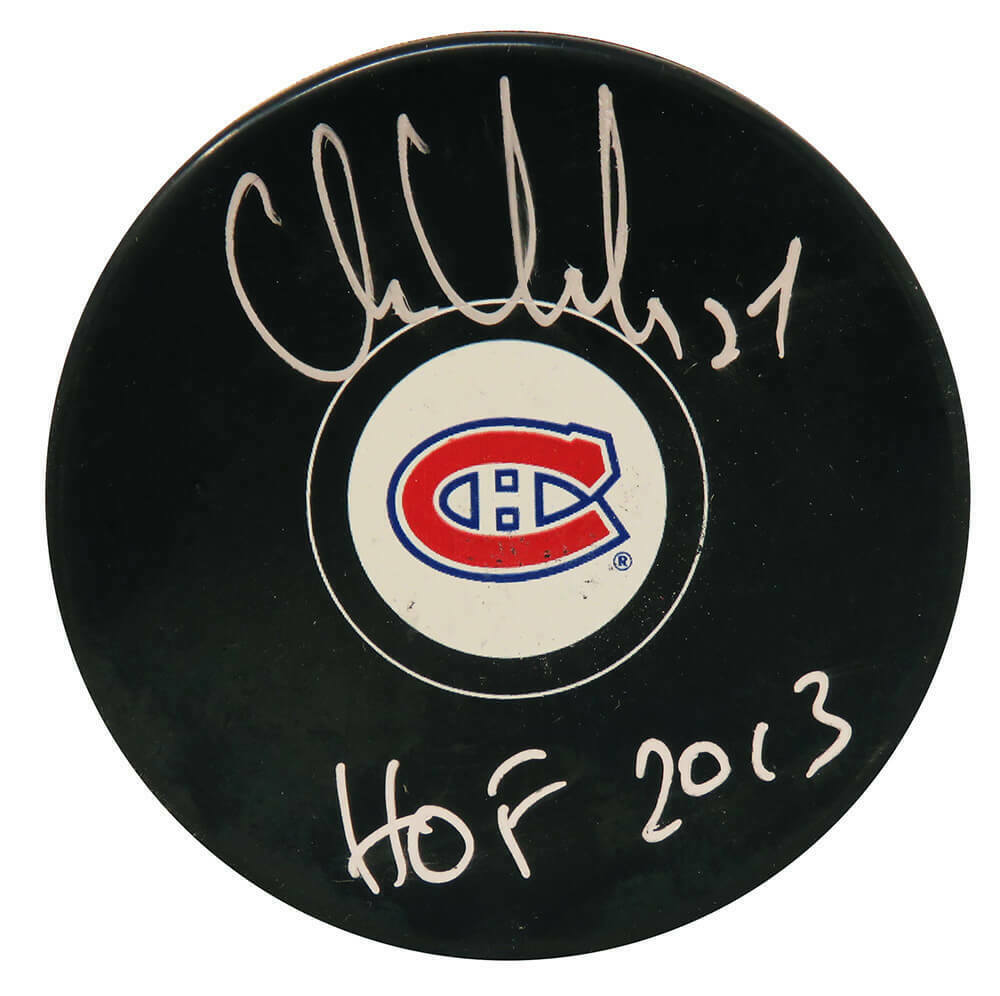 Chris Chelios signed Montreal Canadiens logo hockey puck with 'HOF 2013' inscription. Item comes with a Schwartz Sports Memorabilia tamper-proof numbered hologram and Certificate of Authenticity which can be verified online.