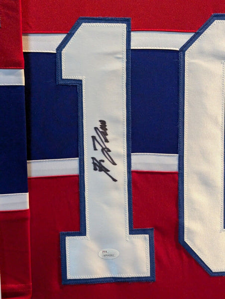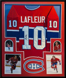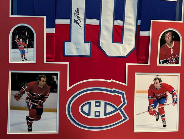Custom Framed Guy Lefleur hand signed Montreal Canadiens custom jersey. JSA Hologram and COA This signature is Certified Authentic by a representative of JSA. The jersey has fully stitched numbers on the front and back. It is a great item and a must for all great sports fans! This item is professionally framed, it measures 32"x40" inside , 42"x34" outside , using UV protective Acrylic glass for safe keeping and safe transport, team color matting, black moulding and hanging hooks on the back. All additional items in frame seen in pictures included. 100% ready to hang in your fan cave.