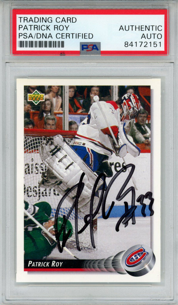 Patrick Roy Autographed/Signed 1992 Upper Deck #149 Trading Card PSA Slab 43804 The number in the listing title is just an inventory sku for our records and is not the authentication number. This is the exact item that you will receive so please see pictures for condition. This is a trading card that was personally autographed by Patrick Roy. This has been professionally slabbed by Professional Authentication Services (PSA) and includes a certificate of authenticity from Denver Autographs.