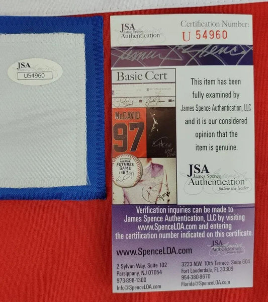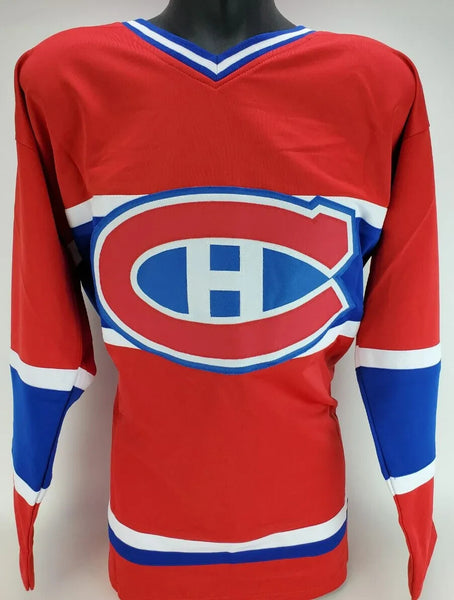 Custom on-ice style jersey. Everything is sewn on, size XL. Hand-signed and inscribed in black felt-tip pen by Yvan Cournoyer (Montreal Canadiens, HOF). The lot / autograph(s) includes an official James Spence Authentication (JSA) hologram and matching COA for authenticity purposes. The signing of this item was witnessed by JSA.Authentication: JSA COA