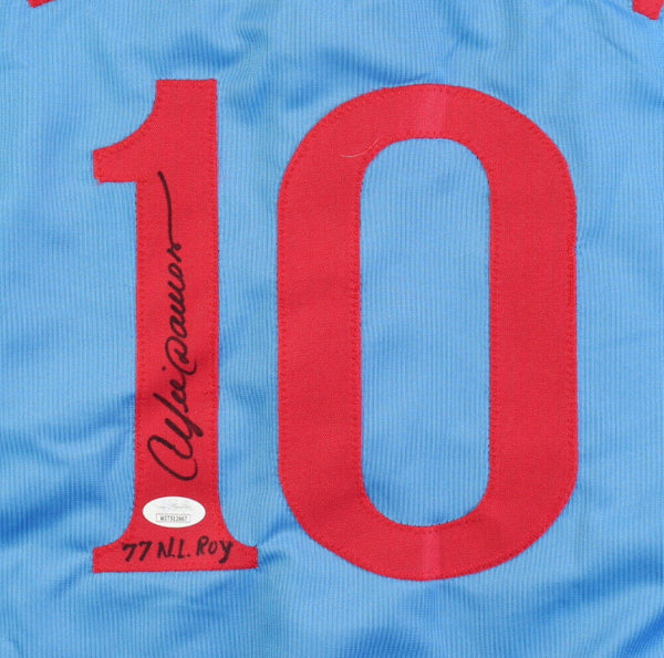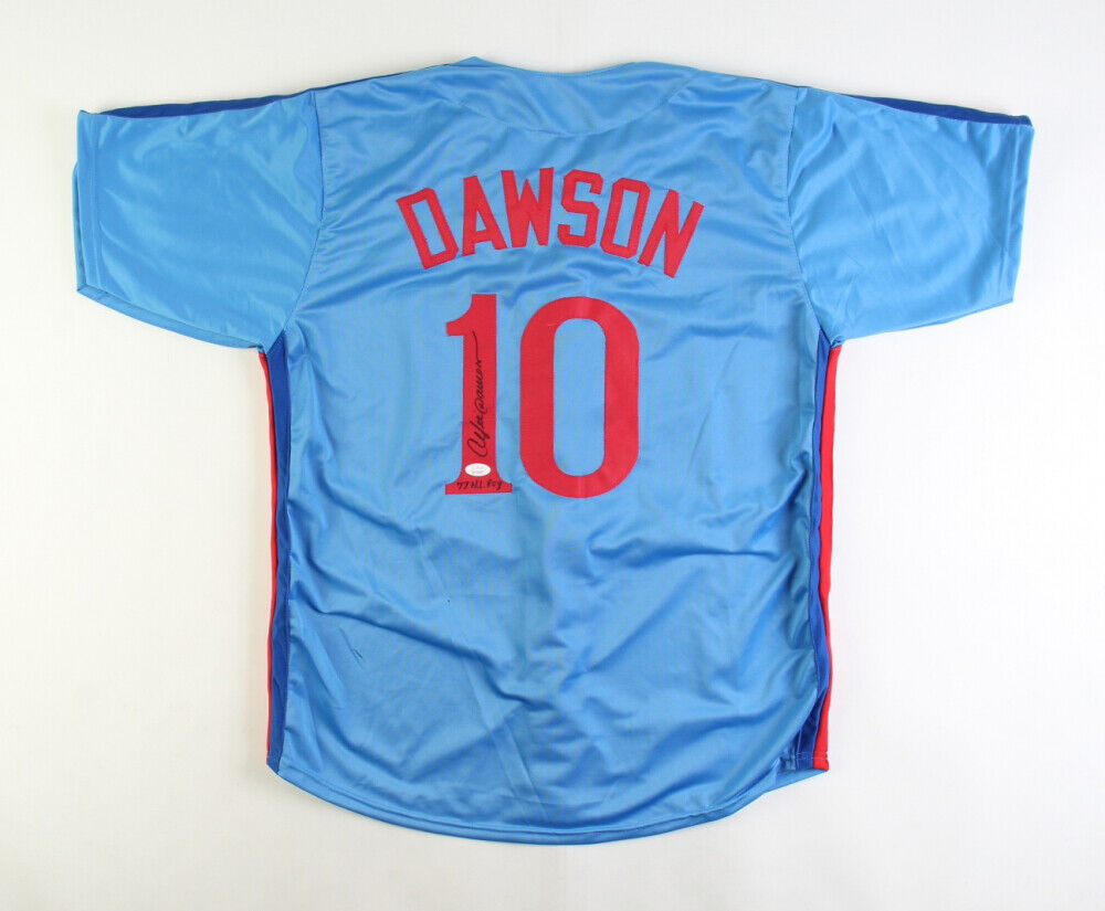 Custom on-field style jersey. Everything sewn on, size XL. Hand-signed and inscribed by Andre Dawson (HOF).The lot / autograph(s) includes an official James Spence Authentication (JSA) hologram for authenticity purposes. The signing of this item was witnessed by JSA.Authentication: JSA Hologram