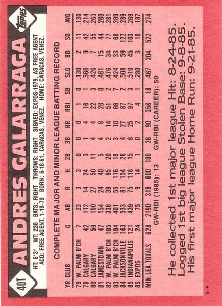 A 1986 Topps 40T Montreal Expos Baseball Card hand signed by Andres Galarraga. The item and signature are in excellent condition. Galarraga is a 5x All-Star, won two National League Gold Glove Awards, two NL Silver Slugger Awards, and won the MLB Comeback Player of the Year Award. AUTHENTICATION: The item is accompanied by a Certificate of Authenticity - Serial Numbered and Databased Hologram - picture of Andres from the signing -