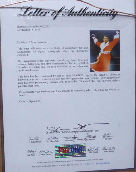 This is a Framed 16x20 Photo, approximately 24x28 with the frame, that has been hand signed by Muhammad Ali. It has been certified authentic by PSA/DNA and comes with their sticker and matching full page certificate of authenticity.