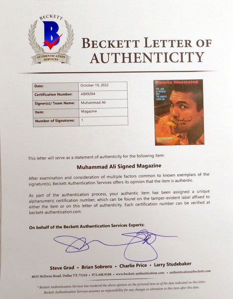 This is a Sports Illustrated Magazine that has been hand signed by Muhammad Ali. This item has been certified authentic by Beckett Authentication (BAS) and comes with their tamper-proof sticker and matching full-page certificate of authenticity. NOTE: The magazine has some minor creases and tears on the cover, as shown in the pictures.