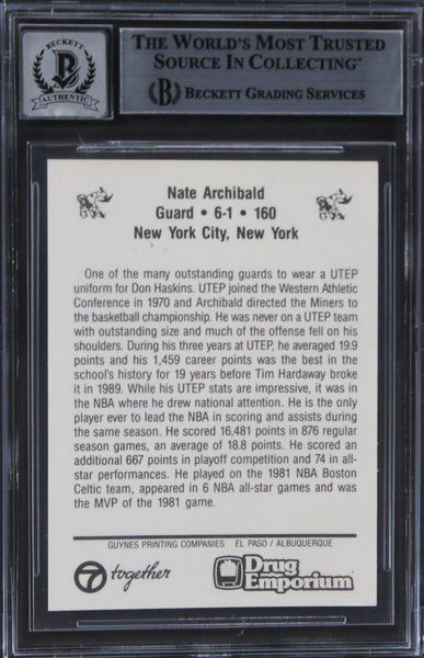 This Autographed Auto 10 1989 Utep #1 Card has been Personally Signed by Nate Archibald. This item is 100% Authentic, it comes slabbed and authenticated by Beckett Authentication Services. The authenticity can be verified on Beckett Authentication Services website.