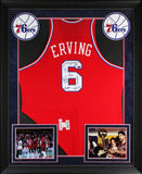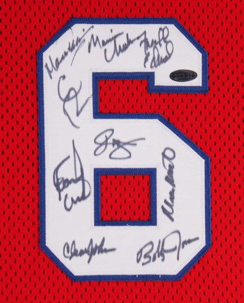 This Autographed Red 1982-83 Mitchell & Ness Framed Jersey has been Personally Signed by Julius Erving, Maurice Cheeks, Moses Malone, Clint Richardson, Bobby Jones, Clemon Johnson, Marc Iavaroni, Franklin Edwards & Earl Cureton of the Philadelphia 76ers. This item is 100% Authentic to include a Certificate of Authenticity (COA) / hologram by Steiner. The authenticity can be verified on Steiner Sports website. This item has been professionally framed to overall dimensions of approximately 37 x 45 inches.