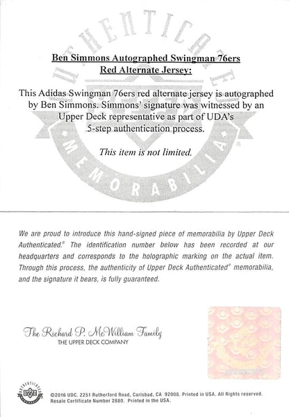 This Autographed Red Adidas Swingman Jersey has been Personally Signed by Ben Simmons of the Philadelphia 76ers. This item is 100% Authentic to include a Certificate of Authenticity (COA) / hologram by UDA. The authenticity can be verified on Upper Deck Authentic website. This is a XX-Large sized Jersey.