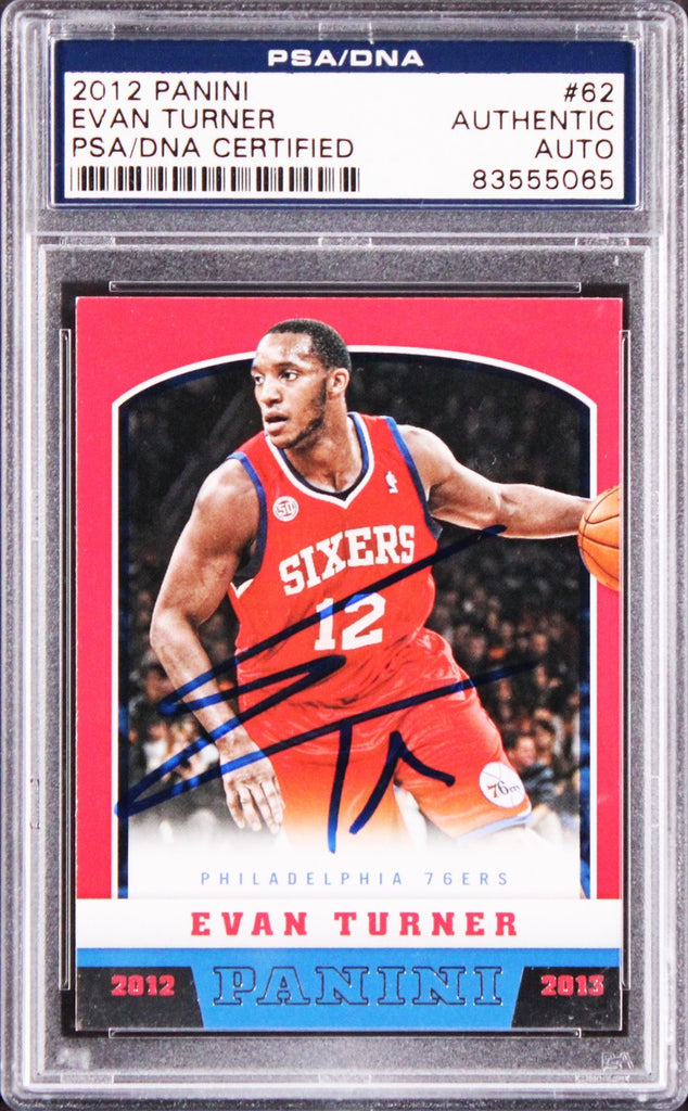 This Autographed 2012 Panini #62 Card has been Personally Signed by Evan Turner of the Philadelphia 76ers. This item is 100% Authentic, it comes slabbed and authenticated by PSA/DNA. The authenticity can be verified on Professional Sports Authenticator website.