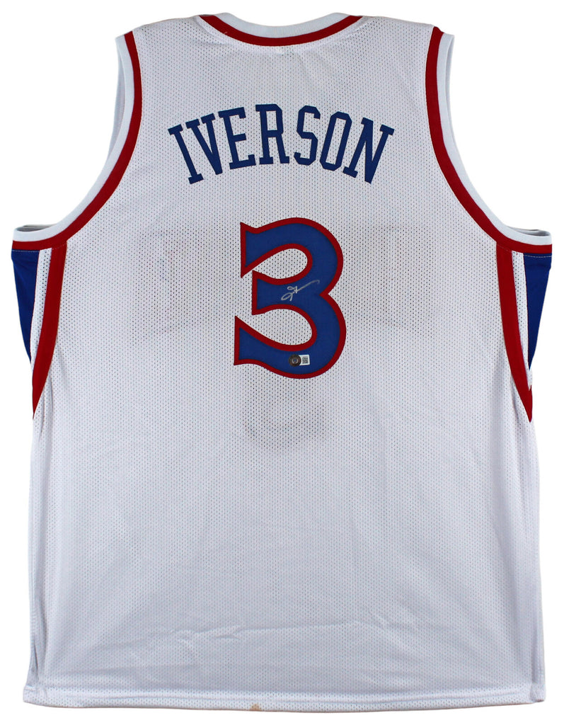 This Autographed White 90's Throwback Pro Style Jersey has been Personally Signed by Allen Iverson of the Philadelphia 76ers. This item is 100% Authentic to include a hologram by Beckett Authentication Services. This item will come with an affixed Beckett Authentication Services (BAS) authentication sticker, which includes a scannable QR code to verify authenticity. Please note that Beckett no longer provides serial-numbered COA cards, and the attached BAS sticker will serve as the complete authentication for this item. This is a BAS Witnessed Protection Program item which means a Beckett Authentication Service representative was present when this item was being signed. We conducted an autograph signing with Allen Iverson where multiples of the same item were signed. While the photographs are representative of this item, the size, placement and strength of the signature may vary. Each item is hand signed, therefore, each autograph is unique. This item can be verified through BAS Witnessed. This is a X-Large sized, non-branded, custom-stitched Jersey.